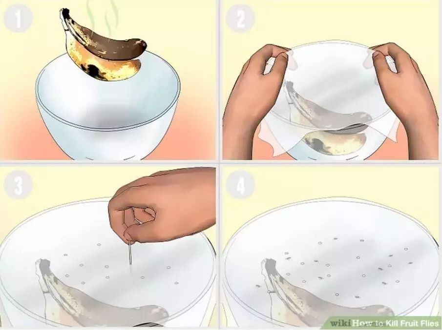 放久了或腐烂的水果放在碗里,用塑料袋或保鲜膜盖住碗包好。用牙签戳几个小洞,放在果蝇易聚集的地方。它们会被味道吸引,进入后再也逃不出去。